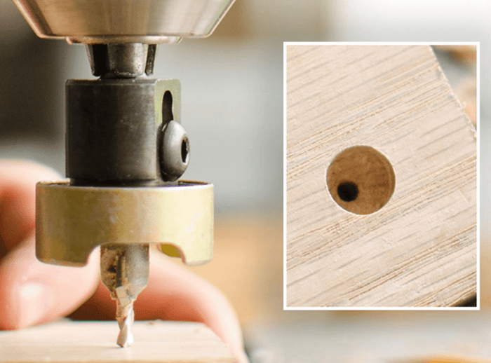 Ces systèmes comprennent un coupe-bouchon qui vous permet de percer, de fraiser, puis de découper un bouchon en bois assorti afin de dissimuler le trou de vis pour une finition plus nette.