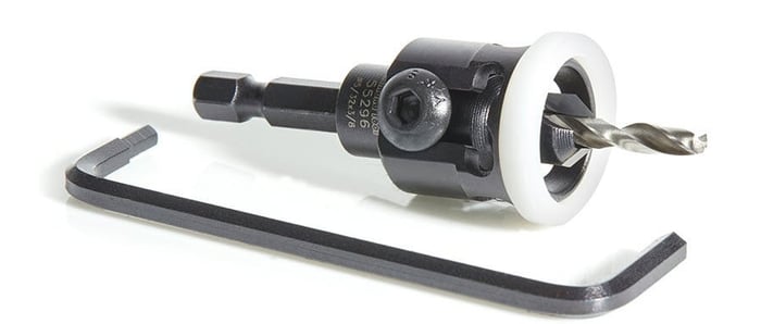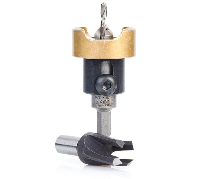 Fraise à chanfreiner à pointe carbure Amana 55296 avec butée de profondeur réglable à faible friction La butée de profondeur réglable à faible friction permet d'obtenir des bords de trou nets tout en facilitant l'évacuation des copeaux. Comprend un foret de rechange HSS entièrement rectifié.3) Jeux de fraises coniques + fraises à bouchons (dissimulation des vis)